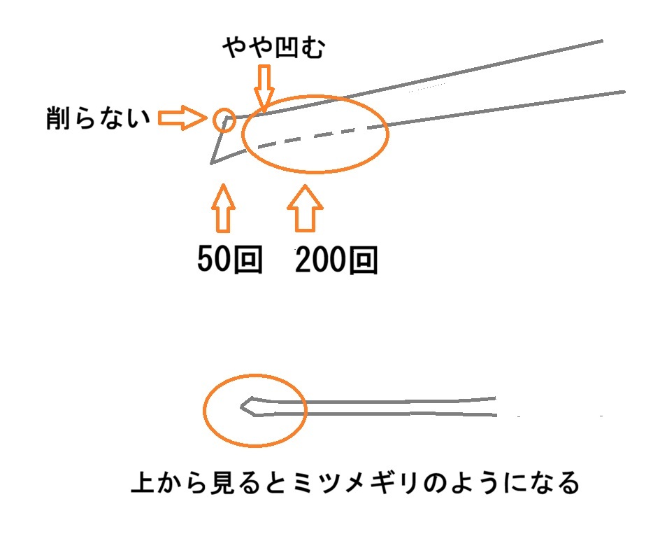 steel)などの合金鋼を型で成形し、その後に焼き入れ・焼き戻しで硬度を調整しています( 先端ほど硬く, 根元ほど粘り強く)。というように、部位ごとに熱処理で性質を変えているはずです。なので先端を削るのは良くありません。