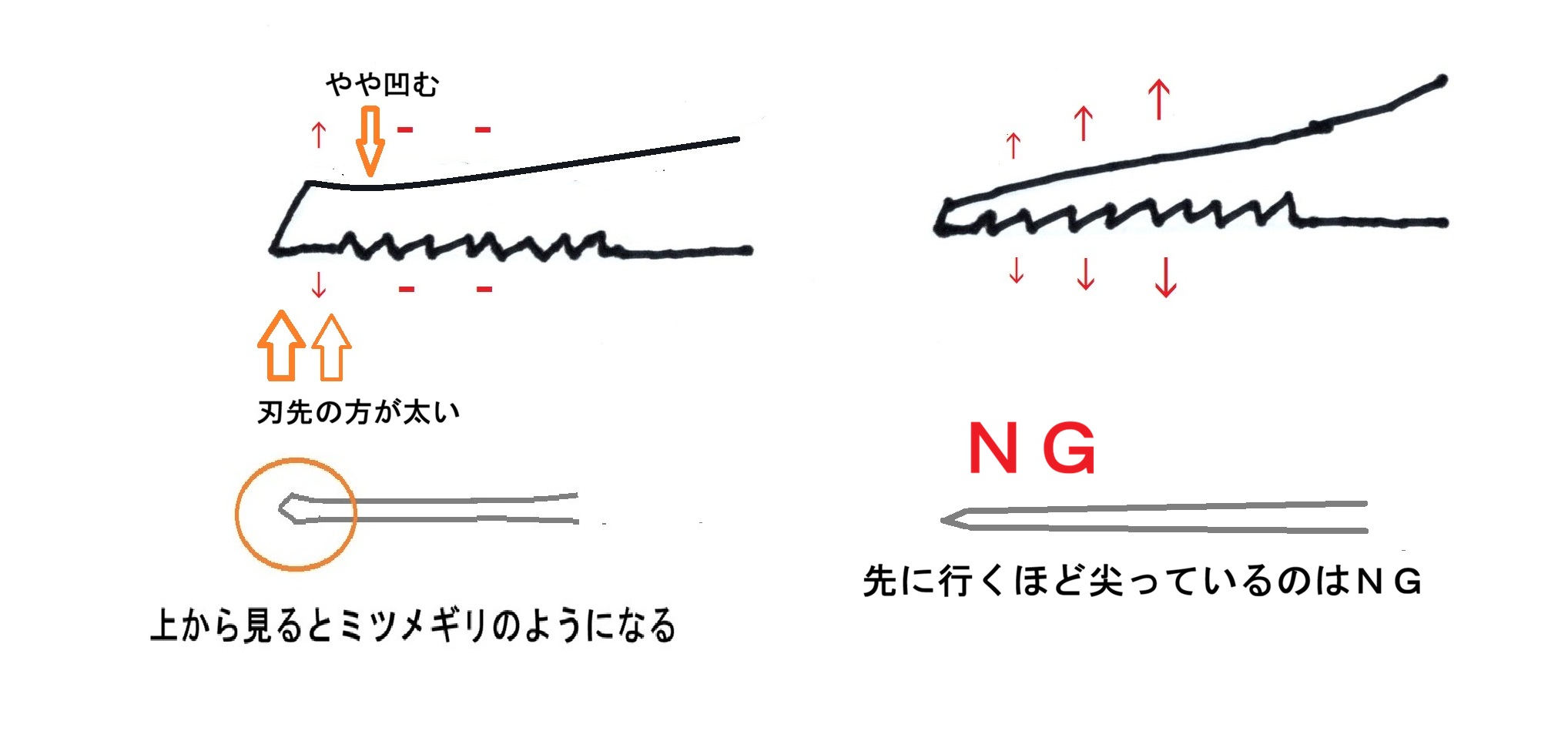 包丁のような形で先端の方を「末広がり」にすれば、上下方向にかかる力が最小限になるが、「先細りの形に」すると上下方向に氷を割る「くさび」になってしまい、打ち込むと大きく円形に氷が割れてしまう。刃先から5ミリ離れた所から3センチくらいまでの所をを薄く削る(基本的に元の形を崩さない)。